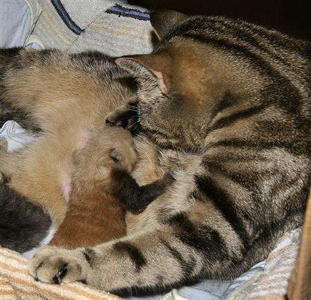 The cat is nursing the red panda, currently about the size of a kitten, along with her own four kittens, the zoo said.